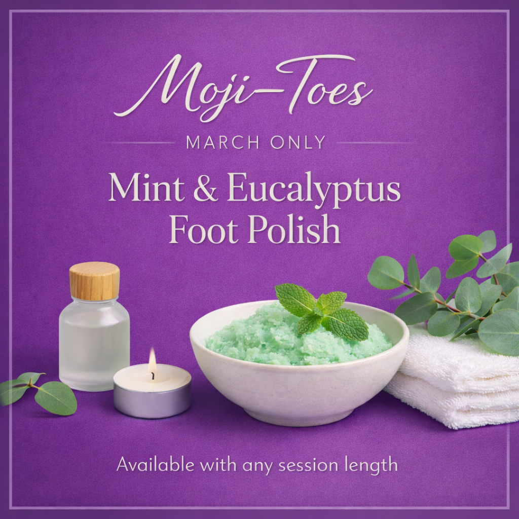Moji-Toes is a refreshing seasonal foot treatment designed to revive tired feet and awaken circulation. The experience begins with a focused foot massage followed by heated stones to soften and warm the muscles. A mint and eucalyptus sugar scrub then gently exfoliates the skin, finishing with warm towels to leave the feet smooth, refreshed and restored.